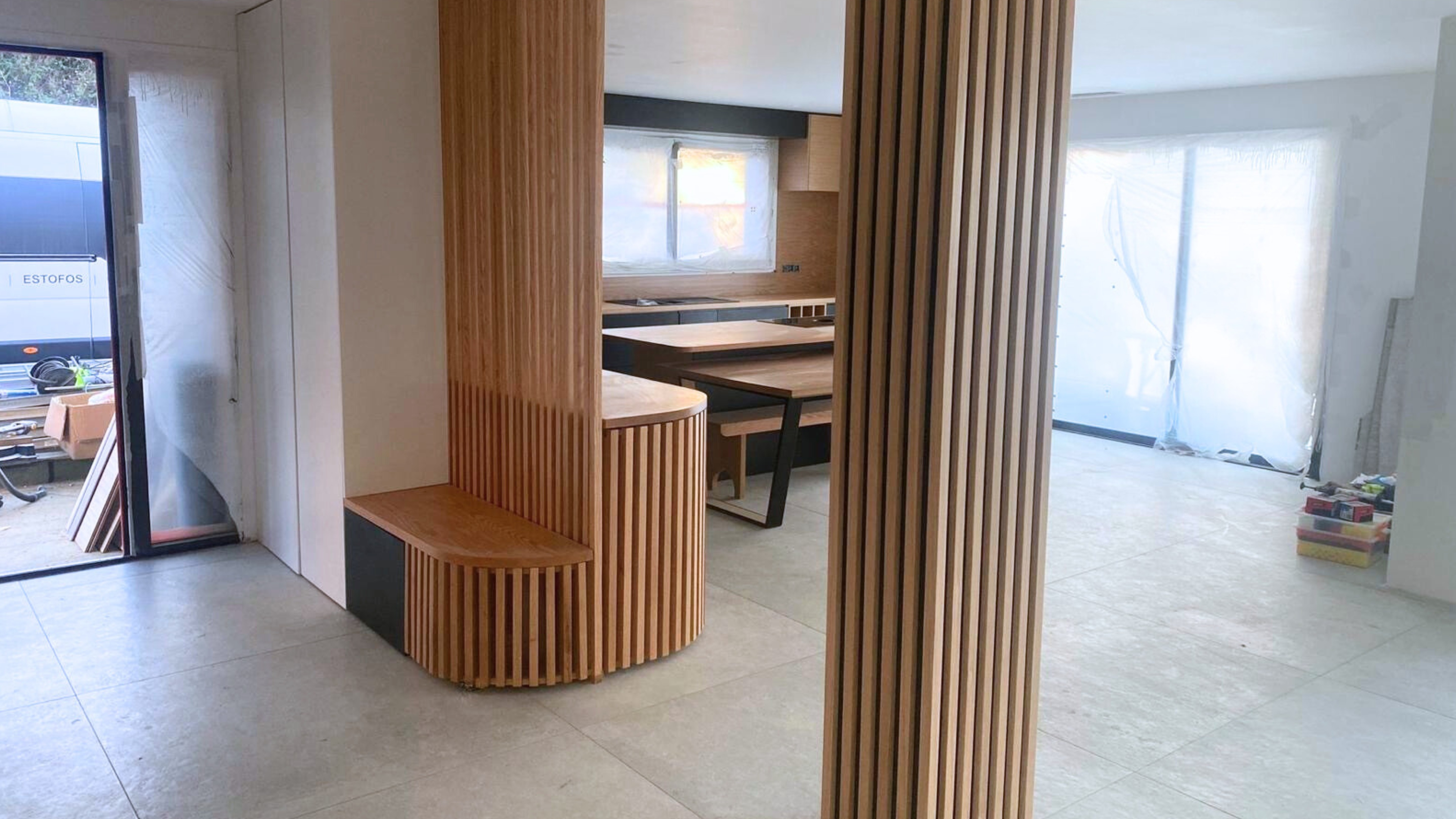 Peças totalmente personalizadas: mesa de jantar, bancos, painéis e soluções integradas. Design exclusivo adaptado às dimensões reais do espaço.