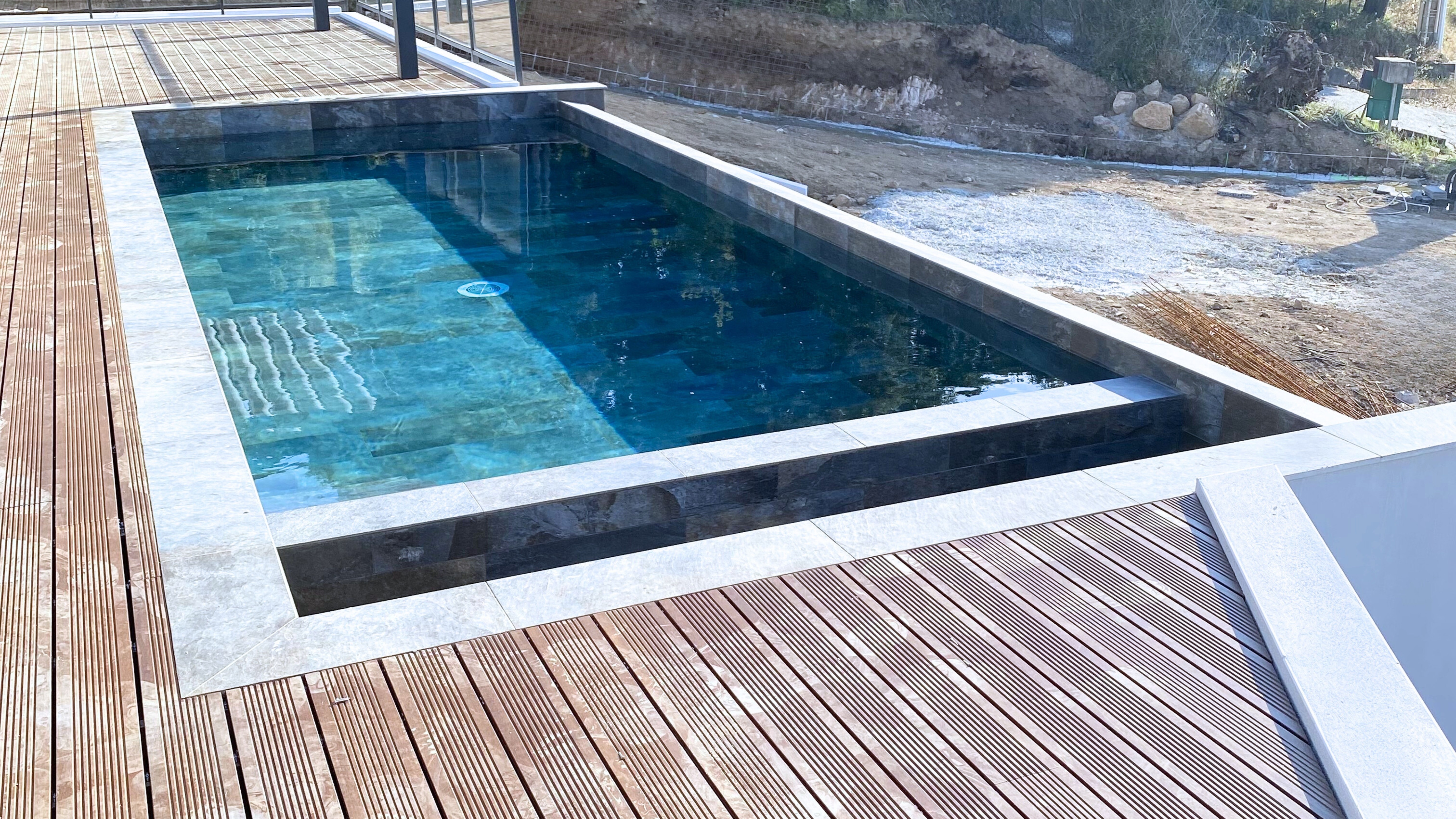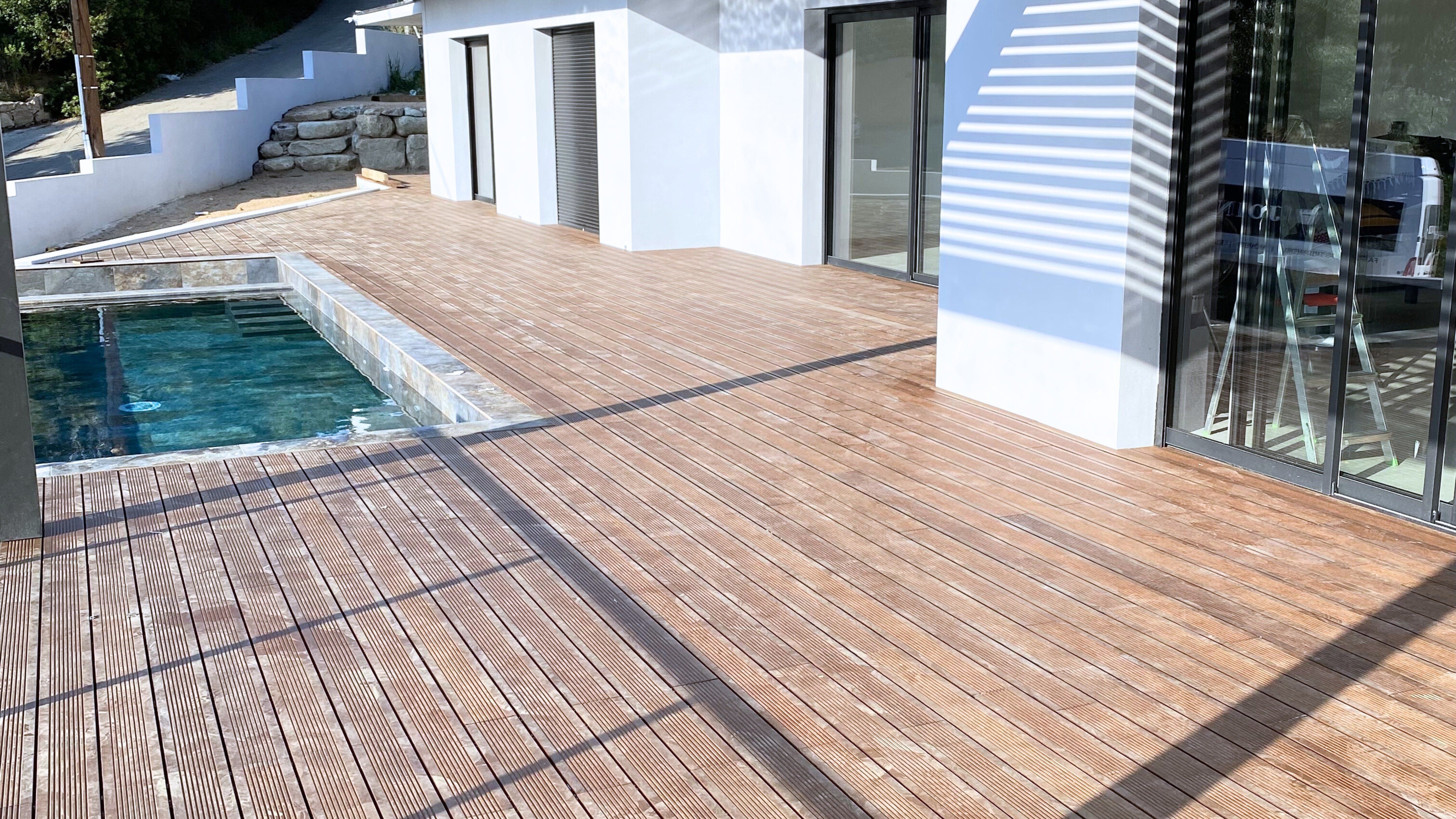 Aplicação de deck em madeira tratada, resistente às condições exteriores e com acabamento cuidado. A continuidade do pavimento reforça a ligação entre interior e piscina.