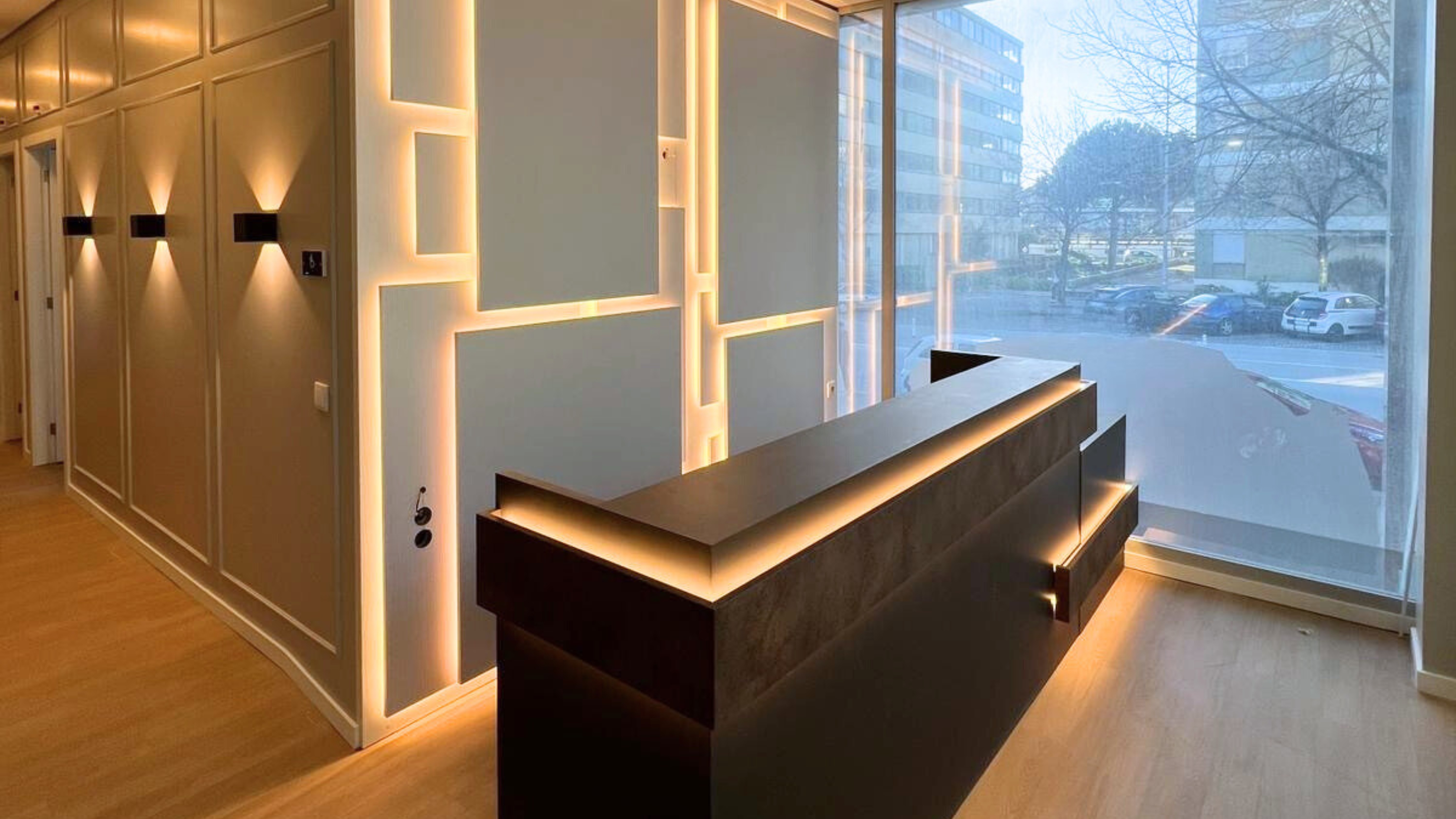 Luz quente estrategicamente posicionada para valorizar volumes, criar ambiente e elevar a perceção de qualidade.