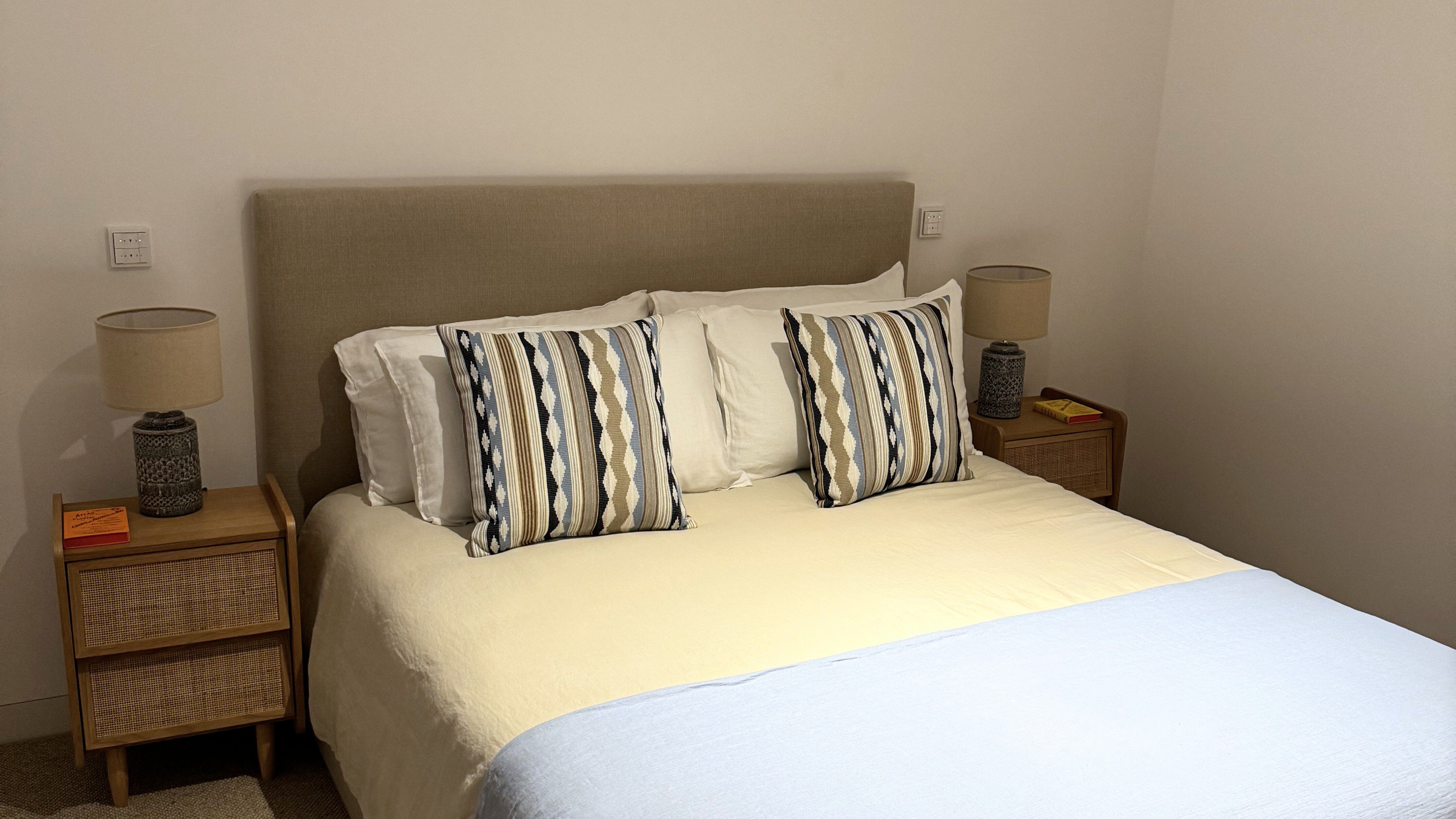 Têxteis claros e apontamentos de cor subtil reforçam a atmosfera tranquila.