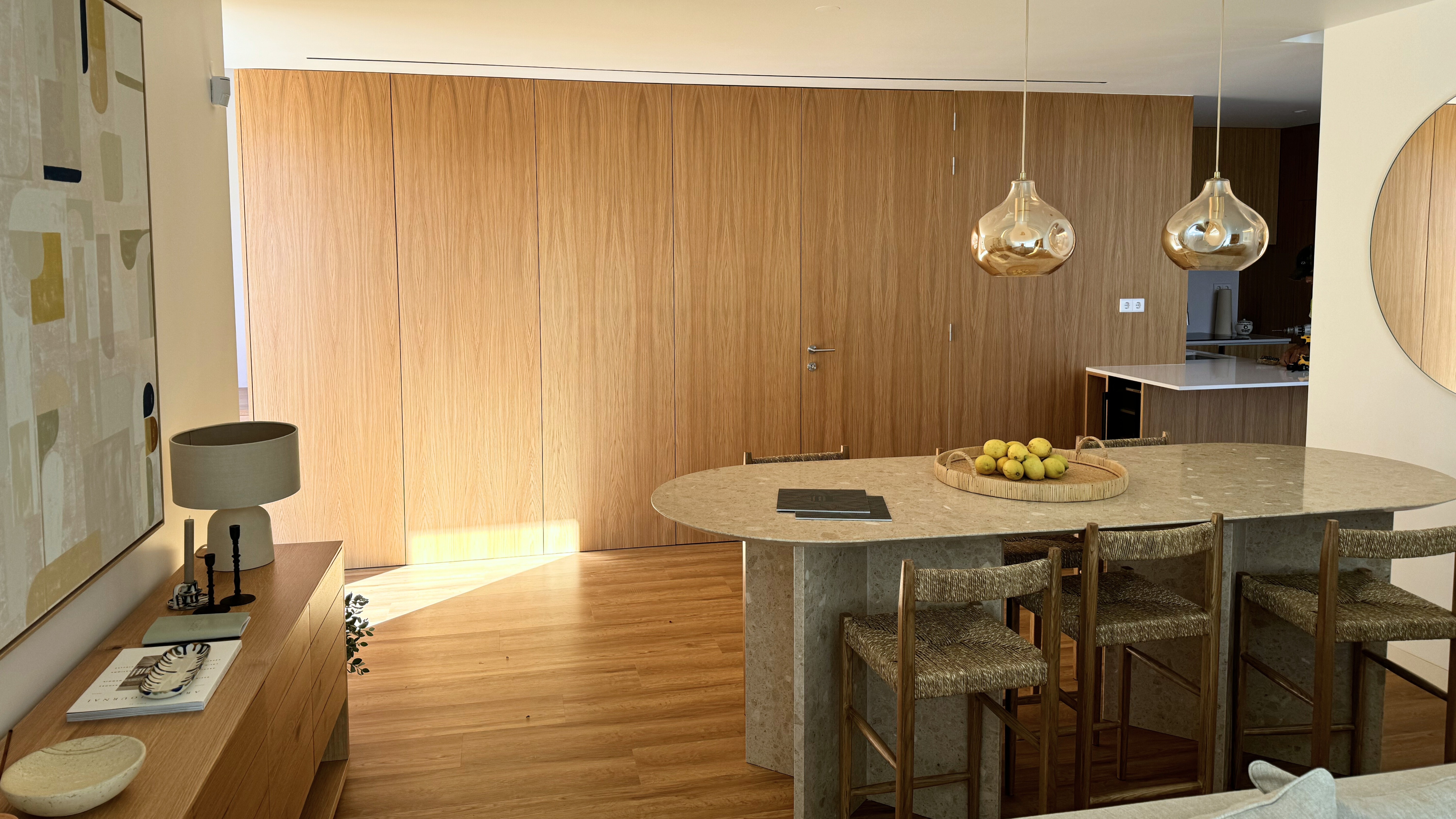 A ilha central assume-se como peça escultórica — minimal, mas protagonista — complementada pela integração discreta da garrafeira e eletrodomésticos.
