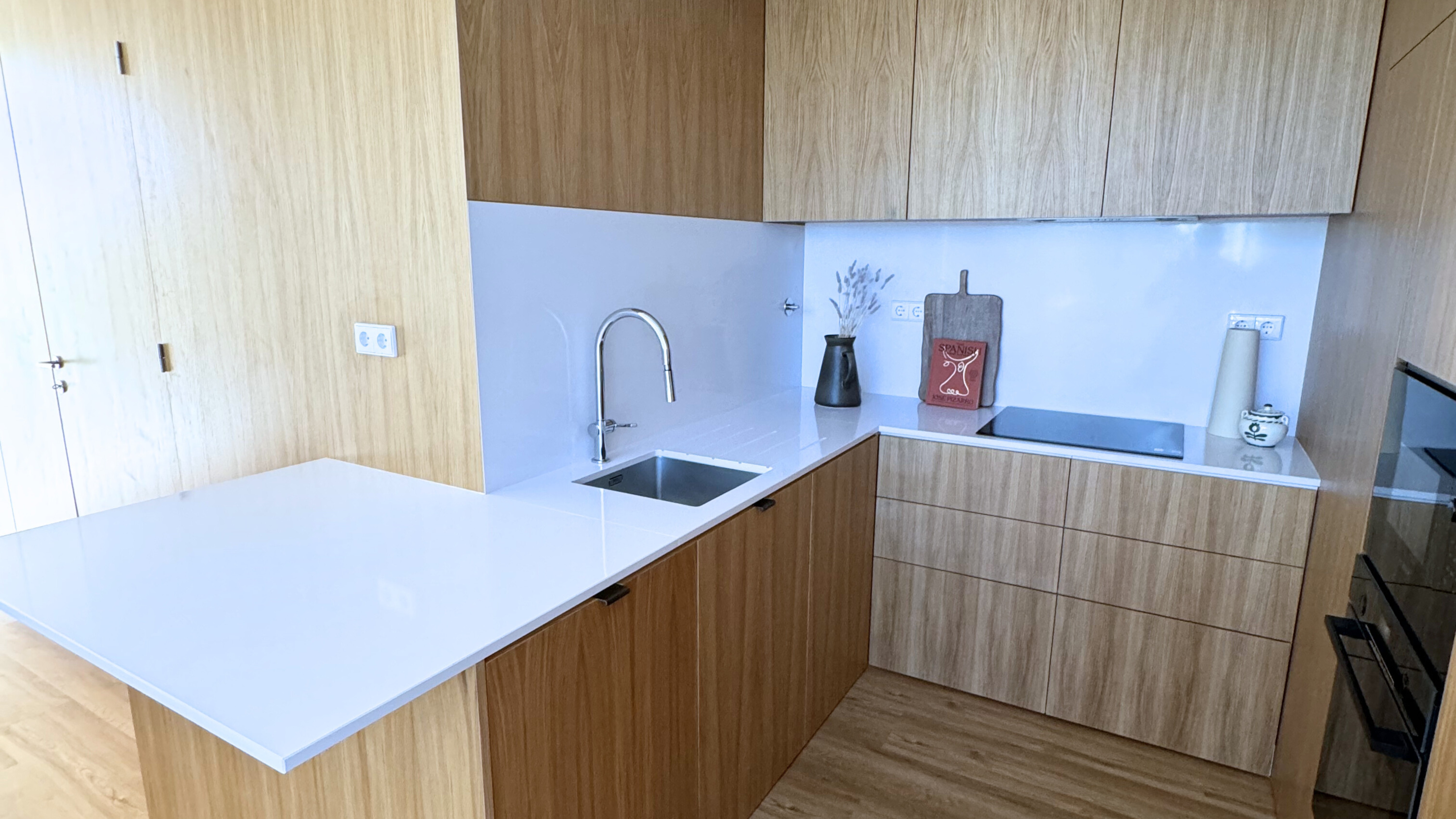 Os tons madeira aquecem o branco técnico da bancada, criando contraste suave e sofisticado.