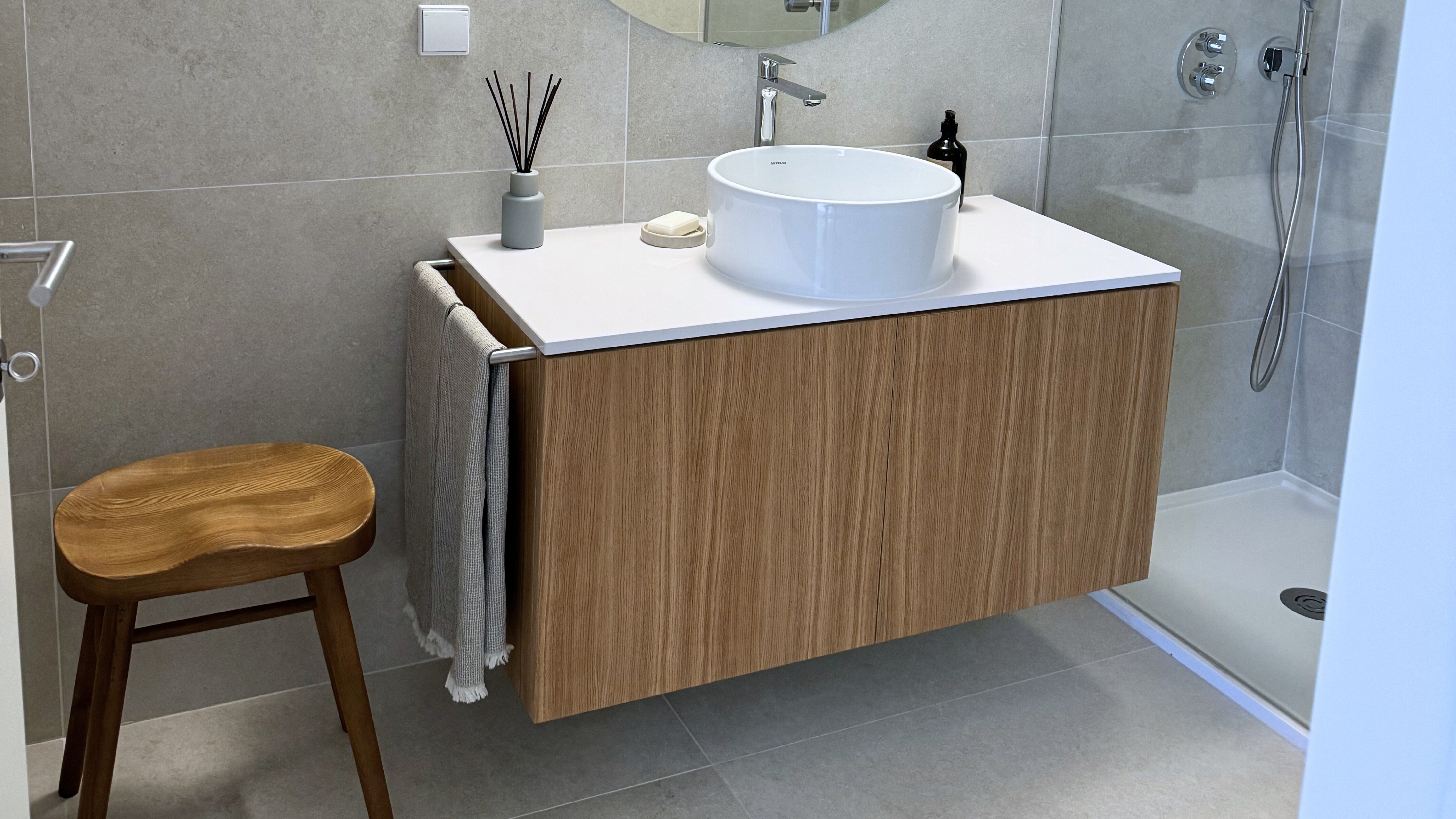 Materiais neutros, formas simples e suspensão visual do mobiliário.