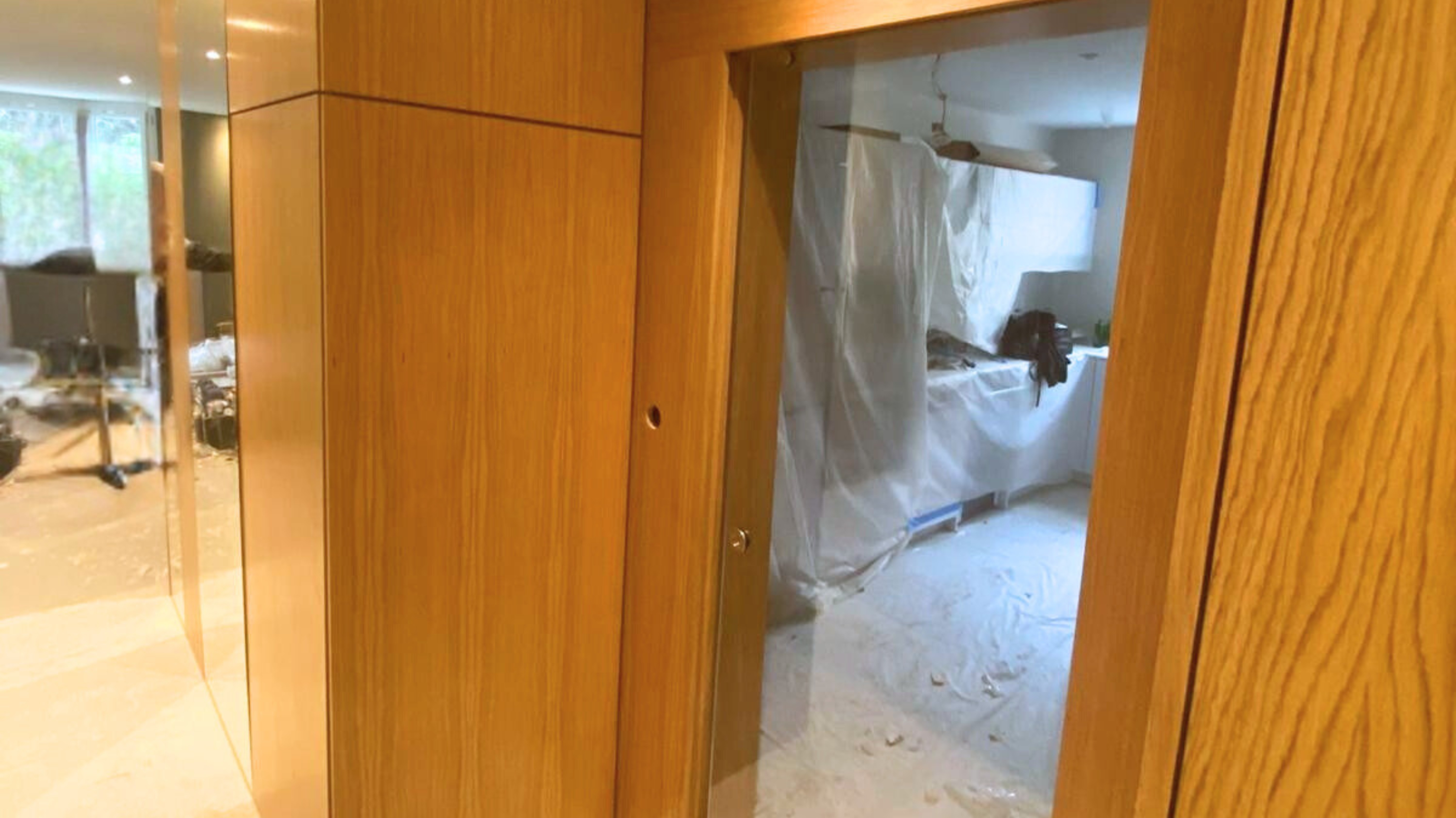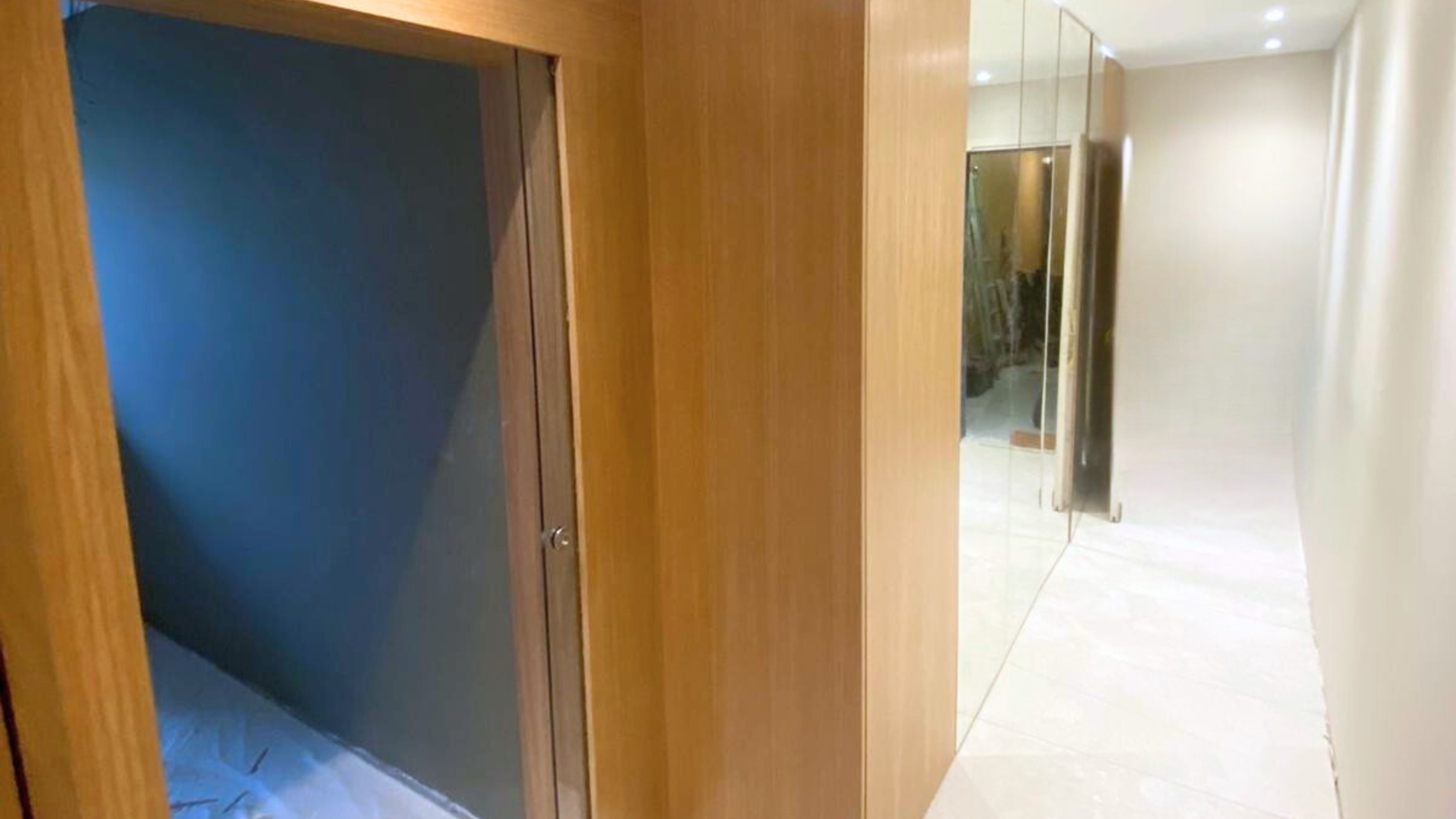 As portas foram totalmente integradas nos painéis de madeira, criando uma leitura contínua e minimalista. O desenho elimina interrupções visuais e reforça a sensação de fluidez.