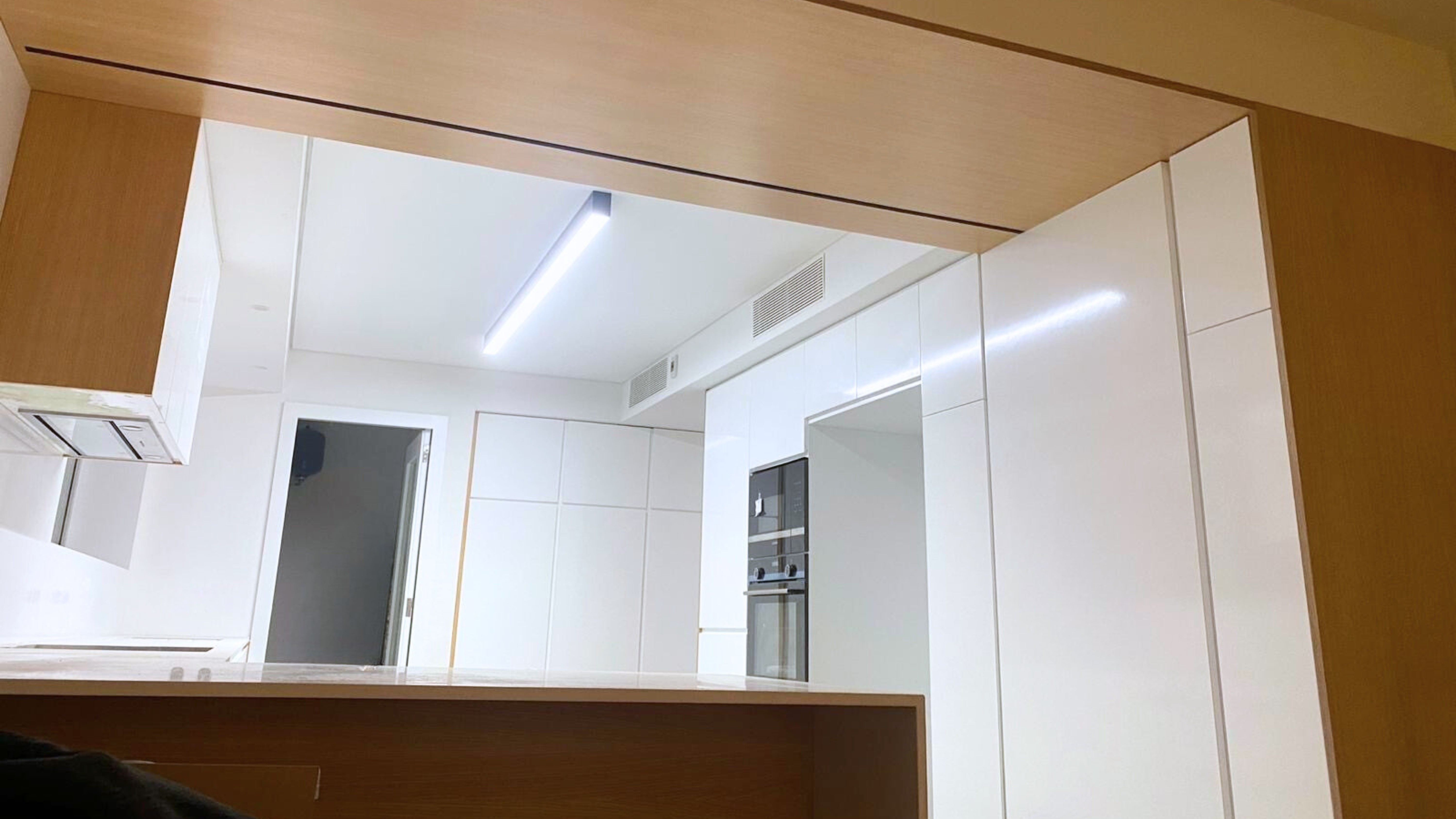 A iluminação LED embutida no teto acompanha a geometria da cozinha, destacando planos e garantindo uma luz uniforme, técnica e elegante.