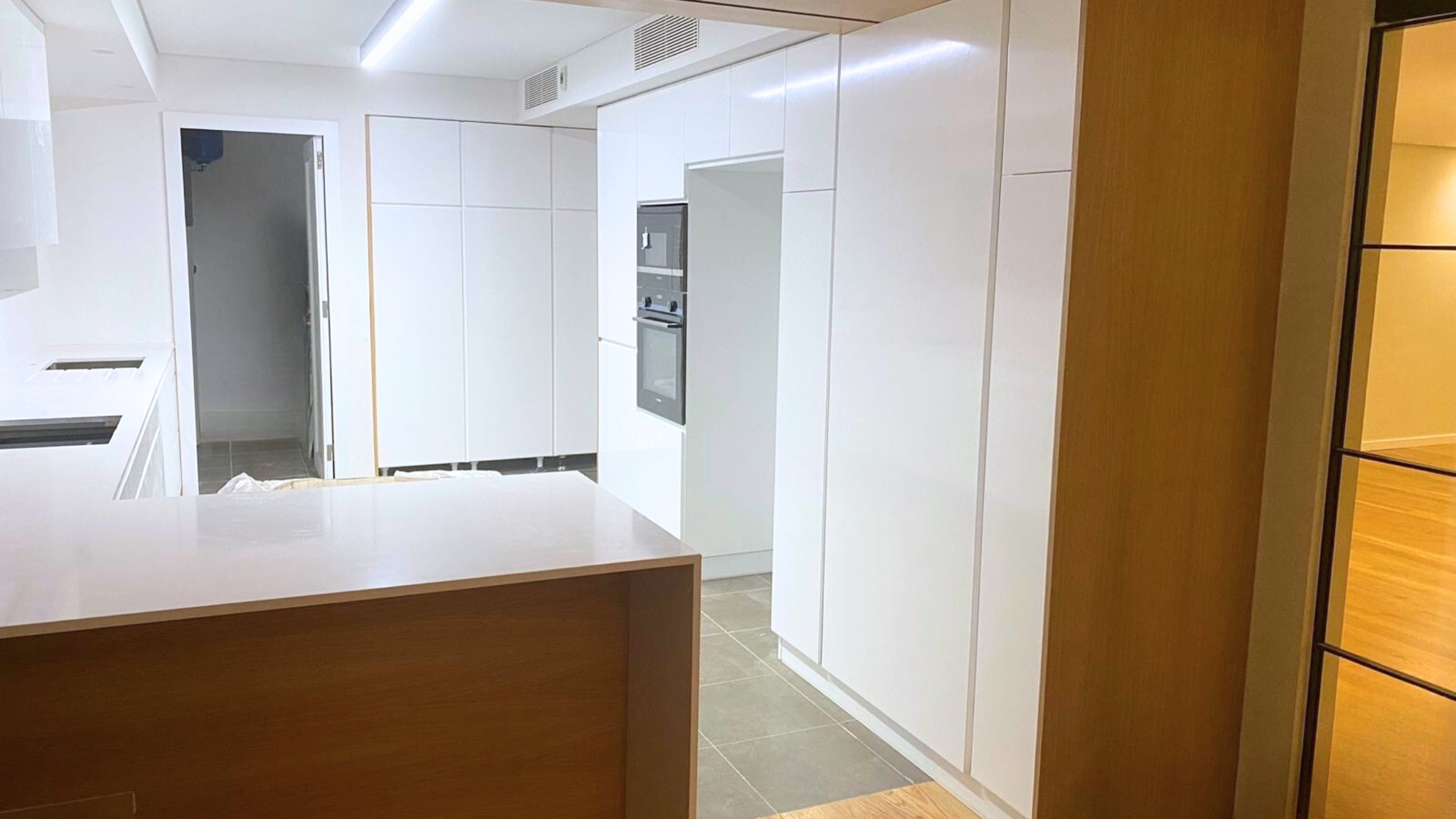 Armários lacados a branco, linhas contínuas e ausência de puxadores reforçam a estética clean. Cada módulo foi desenhado para manter fluidez visual e funcionalidade máxima.
